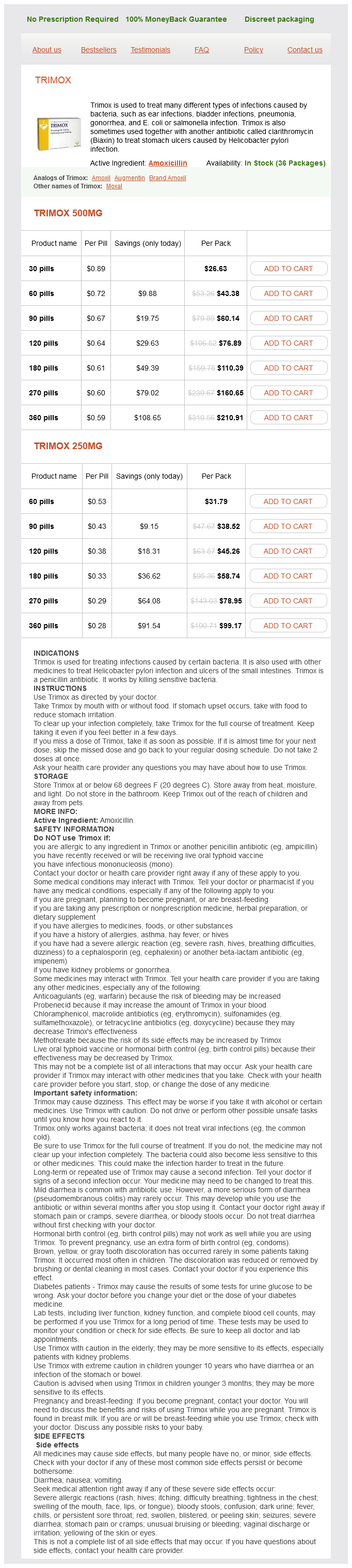 Trimox packs: 30 pills, 60 pills, 90 pills, 120 pills, 180 pills, 270 pills, 360 pills