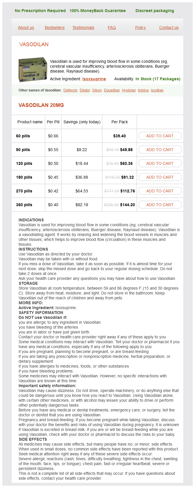 Vasodilan packs: 60 pills, 90 pills, 120 pills, 180 pills, 270 pills, 360 pills