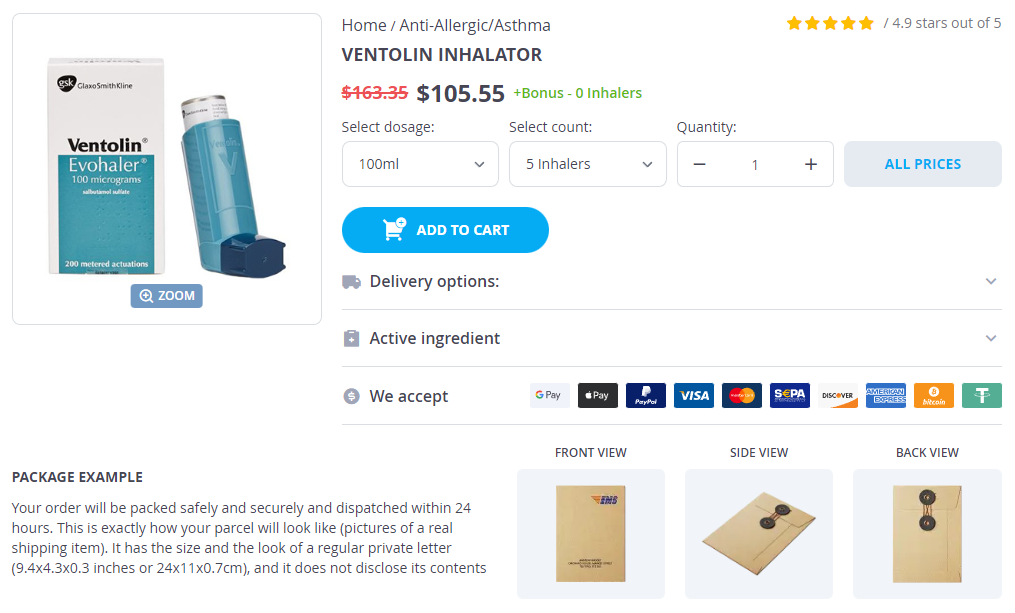 - Ventolin inhalator 100ml × 5 Inhalers - $105.55