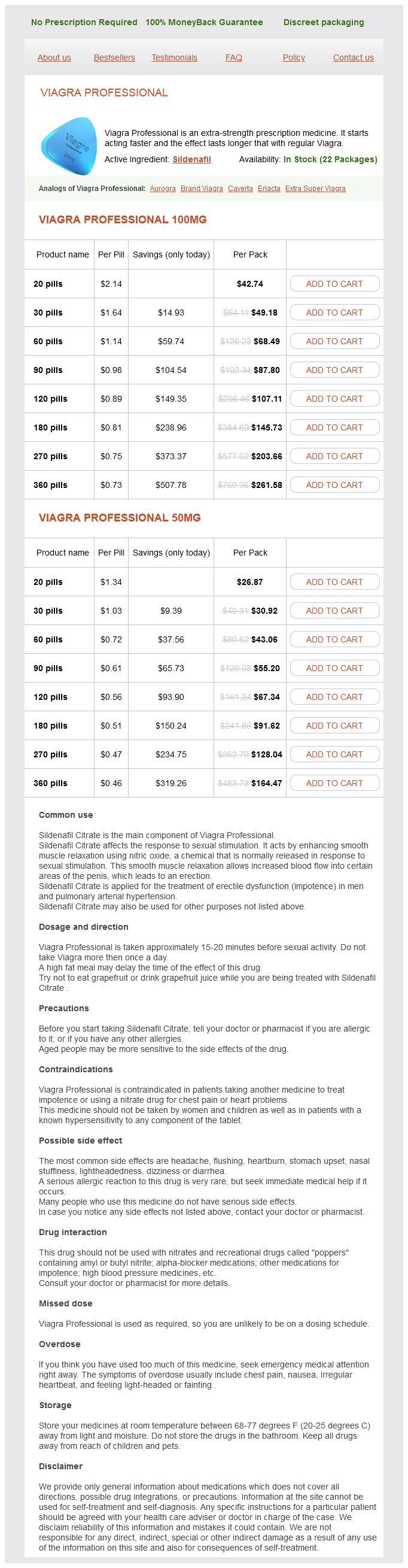 Viagra Professional packs: 20 pills, 30 pills, 60 pills, 90 pills, 120 pills, 180 pills, 270 pills, 360 pills