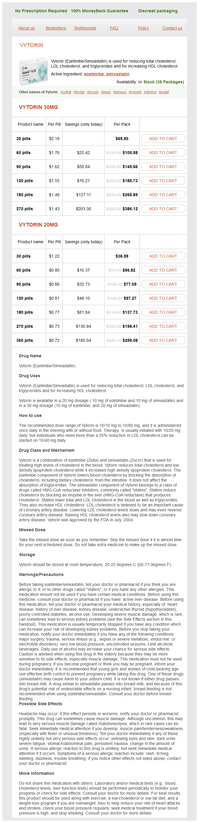 Vytorin packs: 30 pills, 60 pills, 90 pills, 120 pills, 180 pills, 270 pills, 360 pills