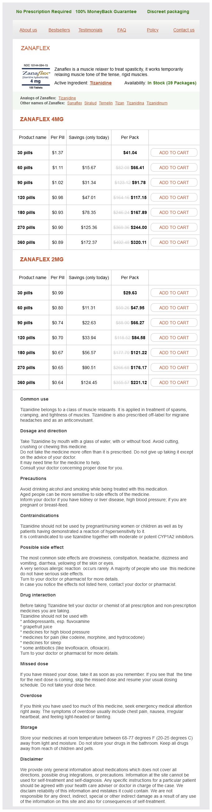 Zanaflex packs: 30 pills, 60 pills, 90 pills, 120 pills, 180 pills, 270 pills, 360 pills