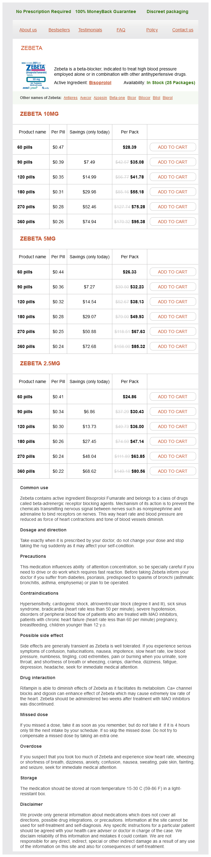 Zebeta packs: 60 pills, 90 pills, 120 pills, 180 pills, 270 pills, 360 pills