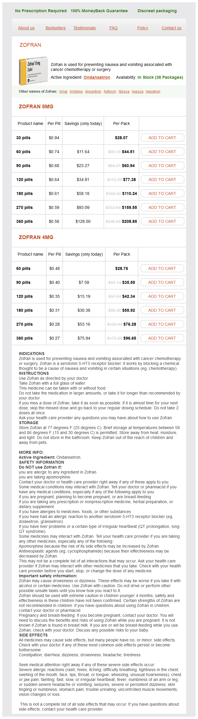 Zofran packs: 30 pills, 60 pills, 90 pills, 120 pills, 180 pills, 270 pills, 360 pills