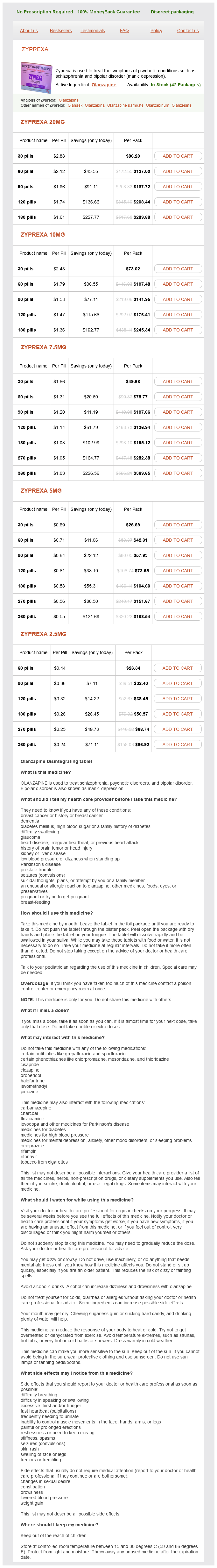Zyprexa packs: 30 pills, 60 pills, 90 pills, 120 pills, 180 pills, 270 pills, 360 pills